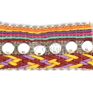 Passamaneria in filo colorato con motivo a treccia multicolor e mezze sfere argentate